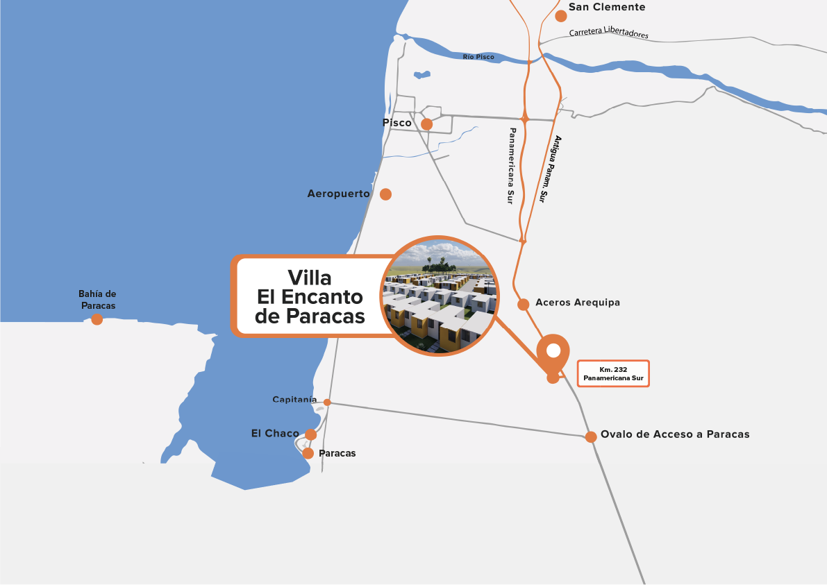 Se encuentra en el KM 232 de la Panamericana Sur, Paracas, Ica. Un lugar perfecto para que tu familia crezca. Con Villa El Encanto el sueño de la casa propia es posible.